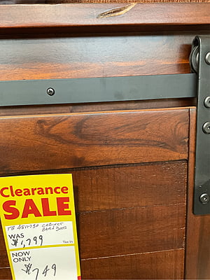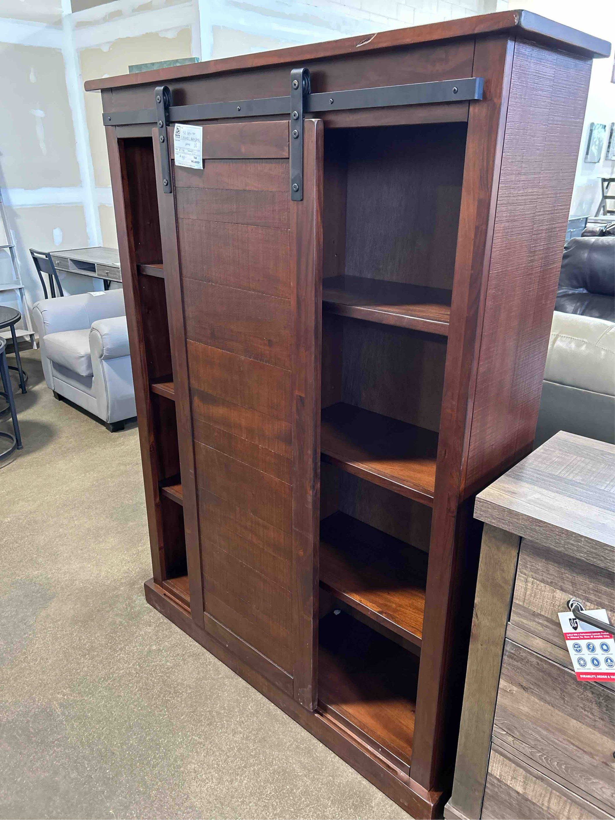 - Sliding barn door hardware - Rough sawn, weathered and distressed - Six adjustable shelves - Solid mahogany and veneers - Elegant chocolate finish DIMENSIONS: - 48" W x 14" D x 66" H