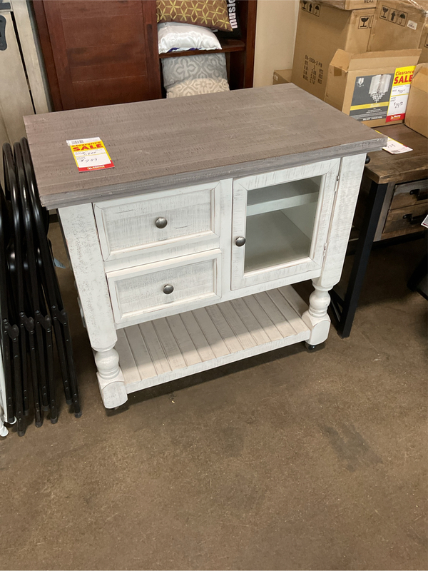 Featuring 100% solid select pine wood - Unique two-tone finish features a hand-rubbed off- white finish and warm gray stain on tops - Two drawers, one glass door, shelves and storage spaces add convenience and versatility - Includes metal towel hanger on side panel - Casters add easy mobility DIMENSIONS: - 39.25" L x 23.5" W x 35.25" H